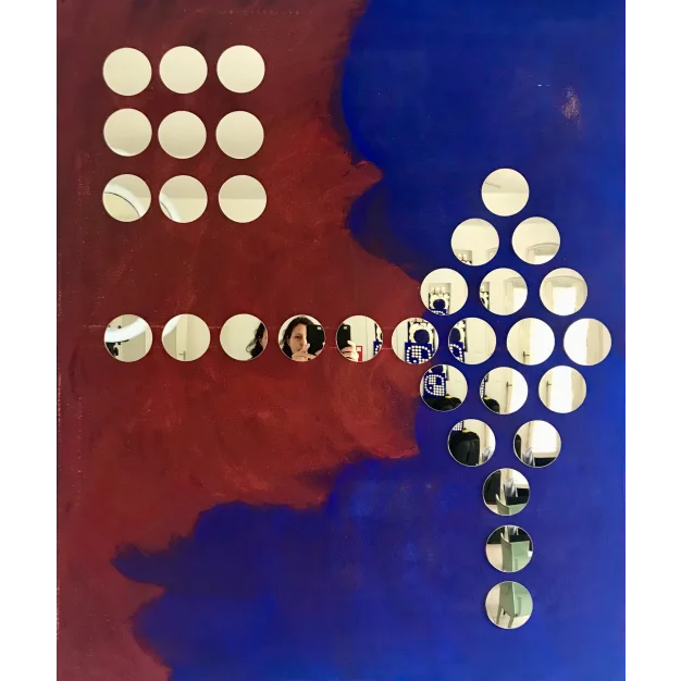 This artwork is a collage of round mirrors on a red and blue background with golden foils underneath the paint, which can be barely seen. The mirrors reflect the viewer in multiple images. An ever changing collage depending the position of the viewer and the objects reflected in the mirrors.