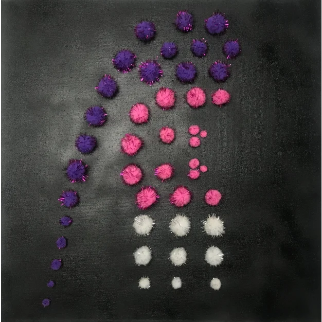 Cubist girl with long hair figure is part of a series of artworks created as a collage of geometrical shapes on canvas and 3D objects.