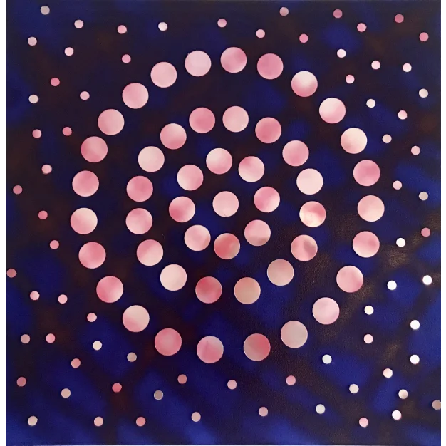 An interactive artwork, that is recreated upon the movements of the viewer, as it reflects its image distorted by the mirror pattern on the canvas.