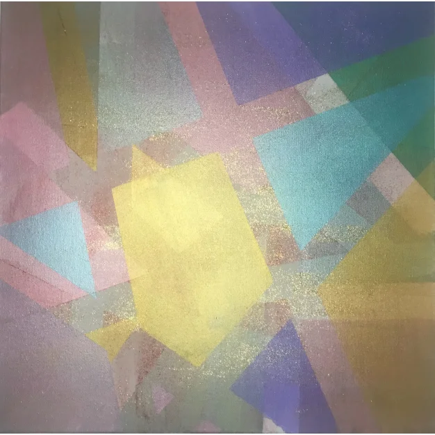 Geometric Symphony is a dynamic painting where layers of forms and colors come together in a visual melody of precision and fluidity. Made with acrylic pearl and glitter paint, the artwork unveils new shapes depending on the lighting and the viewer's perspective.