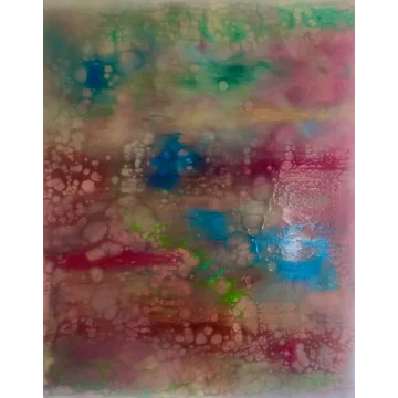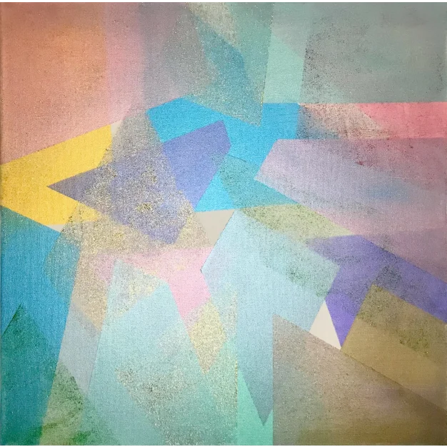 Geometry Unveiled, painted with layers of acrylic pearl and glitter, unveils a dance of overlapping geometric shapes. The final touch of acrylic glitter creates translucent forms that swing and transform with the play of light. It's a celebration of hidden beauty and the dynamic interplay of form and light.