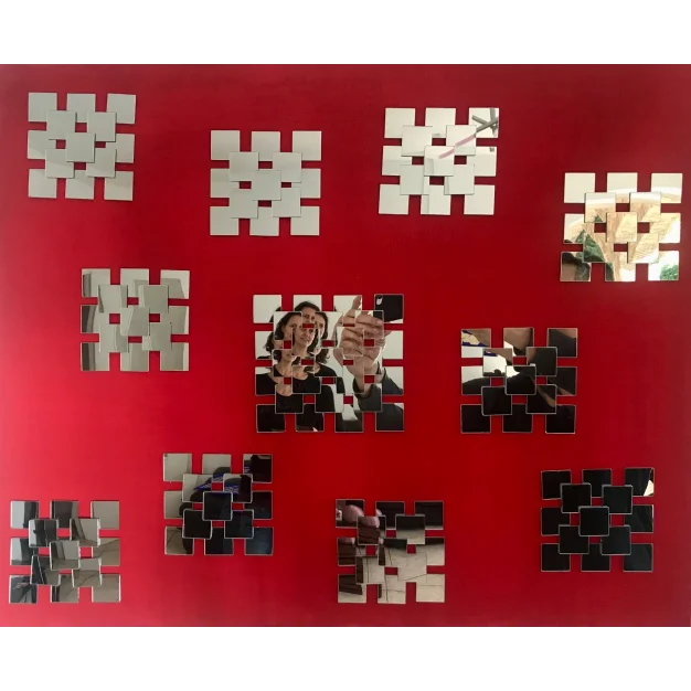 This artwork is a part of a series of collages of mirrors, creating geometric shapes. Its reflection changes depending on the position of the viewer and of the objects in the room. I am calling it therefore interactive artwork.