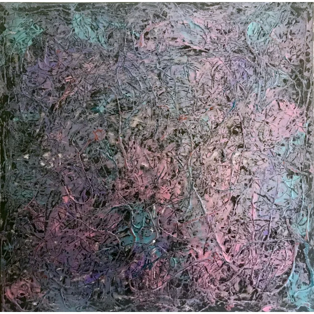 Encuentros es una pintura abstracta que simboliza la fusión entre lo femenino y lo masculino, entre la luz solar y lunar.