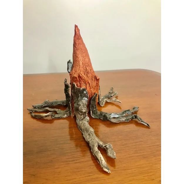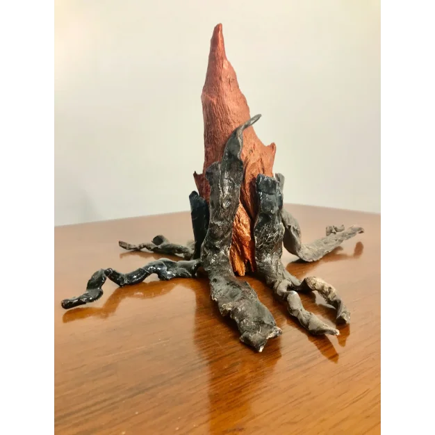 Esta escultura está construida alrededor de un trozo de madera puntiagudo y torcido, que encontré en el bosque. La forma de la madera me intrigó y quise crear una escultura con ella usando la cerámica, así que decidí hacer las 6 raíces de cerámica removibles a su alrededor, lo que le da al comprador la posibilidad de reorganizarlas y modificar la escultura.